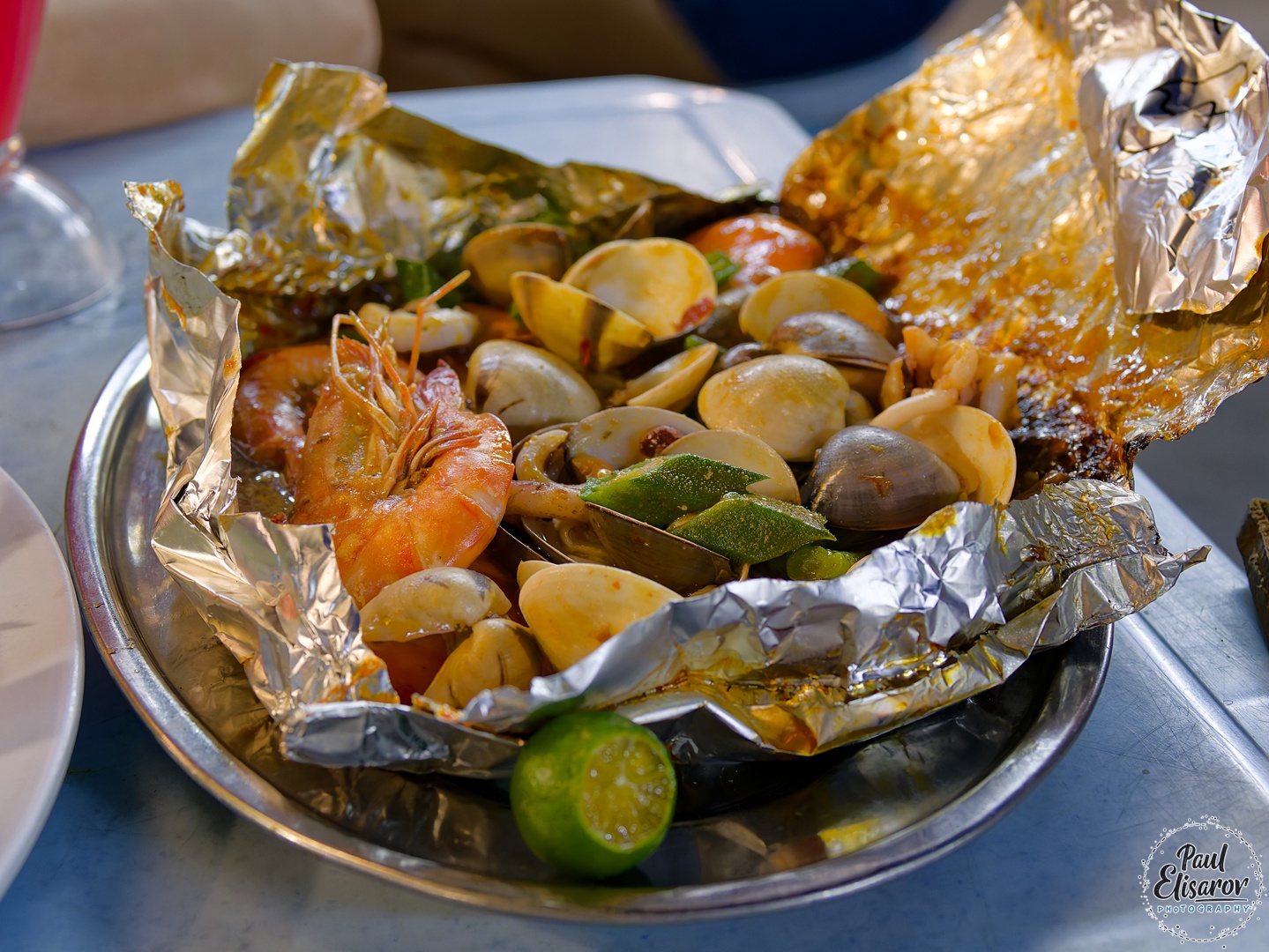 And finally, a plate of grilled Lala mollusks and shrimps, which, let me warn you, is the most aggressively spicy part of the entire spread—tiny seafood shells glazed with chilli that bites hard and lingers long.